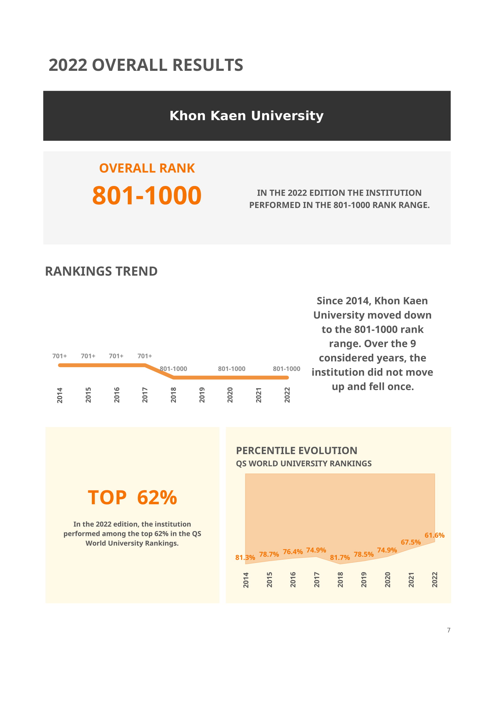 “ตั้งแต่มีการจัดอันดับโดย QS World University Rankings อันดับของมหาวิทยาลัยขอนแก่นดีขึ้นมาโดยตลอด จนปัจจุบันถือเป็นลำดับของการจัดอันดับโดยการอิงกลุ่มของ QS World University Rankings สูงที่สุดตั้งแต่ตั้งมหาวิทยาลัยขึ้นมา ลำดับตามเปอร์เซ็นไทล์เมื่อย้อนไป 10 ปีก่อน เราอยู่เปอร์เซ็นไทล์ที่ 81.3 หมายความว่าหากมี 100 มหาวิทยาลัย เราอยู่อันดับที่ 80 กว่า เมื่อมี 1,000 มหาวิทยาลัย เข้าร่วมการจัดอันดับ เราอยู่ในอันดับที่ 800 และจากผลการจัดอันดับโดย QS World University Rankings ปี 2021 เราอยู่ลำดับเปอร์เซ็นไทล์ที่ 67.5 ปี 2022 นี้ เราอยู่อันดับเปอร์เซ็นไทล์ที่ 61.6 หมายความว่า ถ้า 1,300 มหาวิทยาลัย คิดเป็น 100% เราจะอยู่อันดับที่ 61.6 ซึ่งเป็นอันดับที่สูงขึ้น” ผศ.นพ.ธรา ธรรมโรจน์ กล่าว