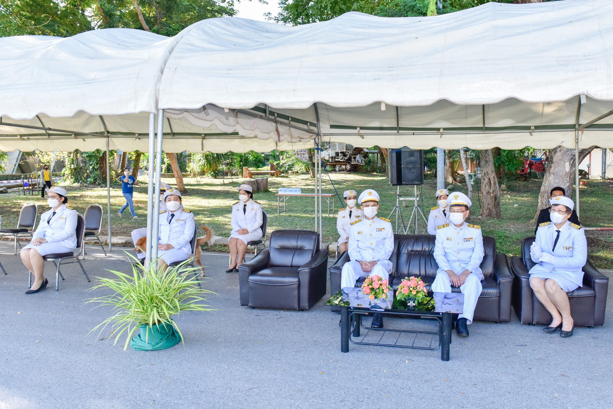 3) การจัดที่นั่งสำหรับผู้แทนหน่วยงานที่มาร่วมพิธีถวายพานพุ่มฯ จัดที่นั่งโดยเว้นระยะห่างตามหลักการของความปลอดภัย (Social Districing)