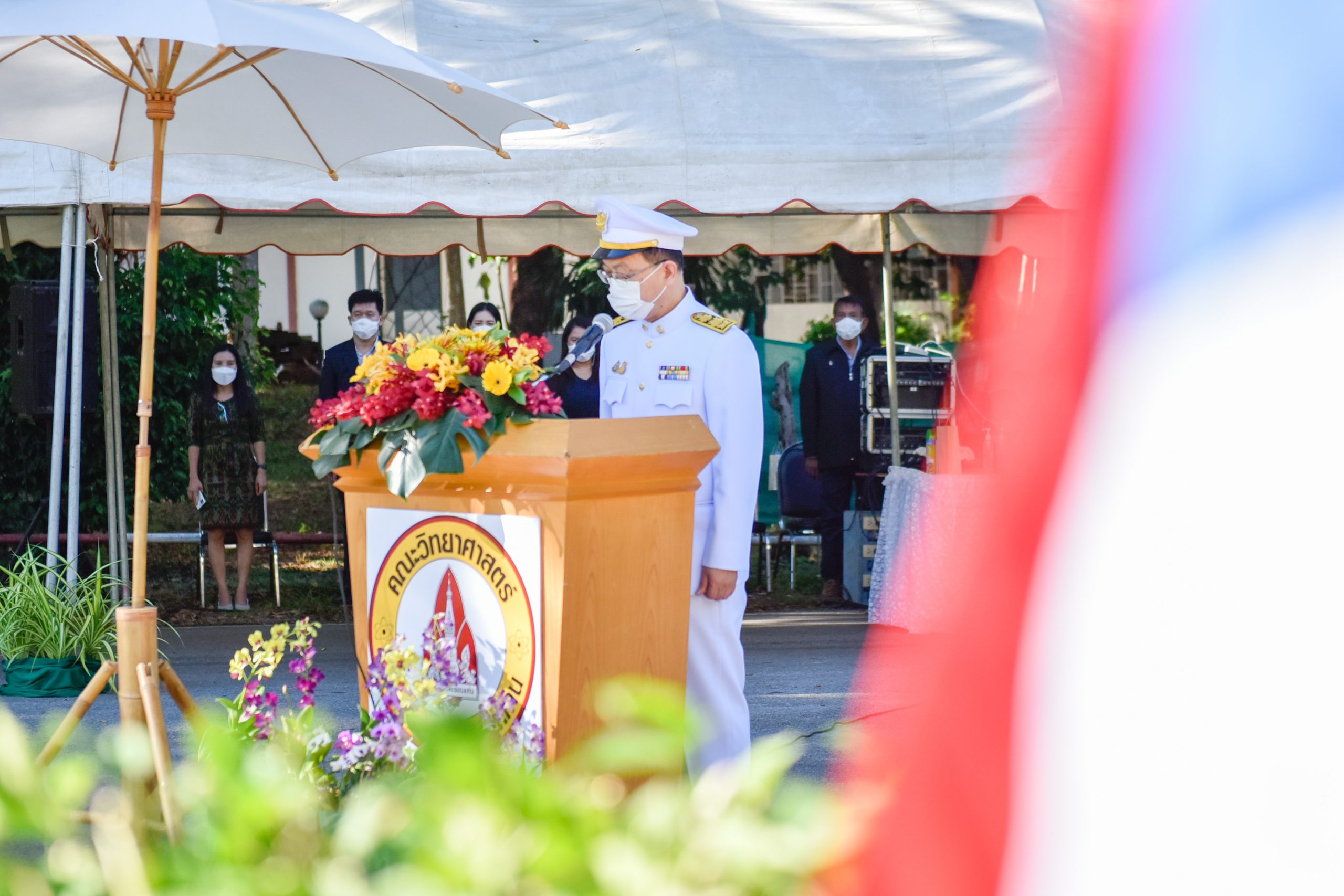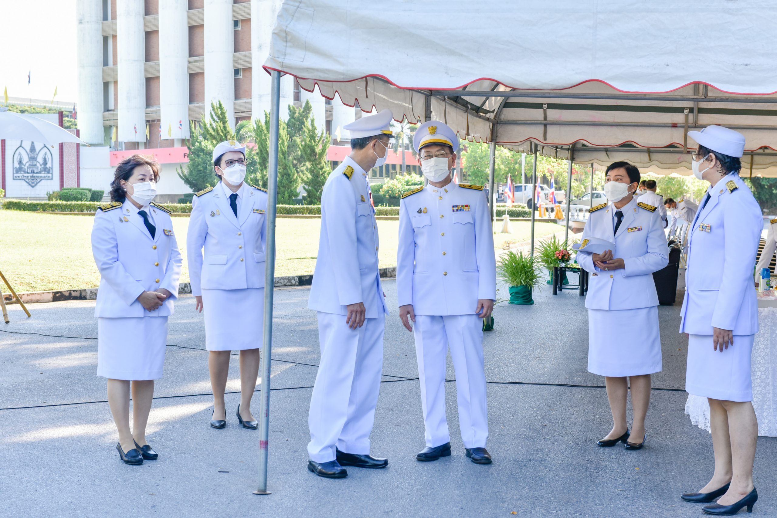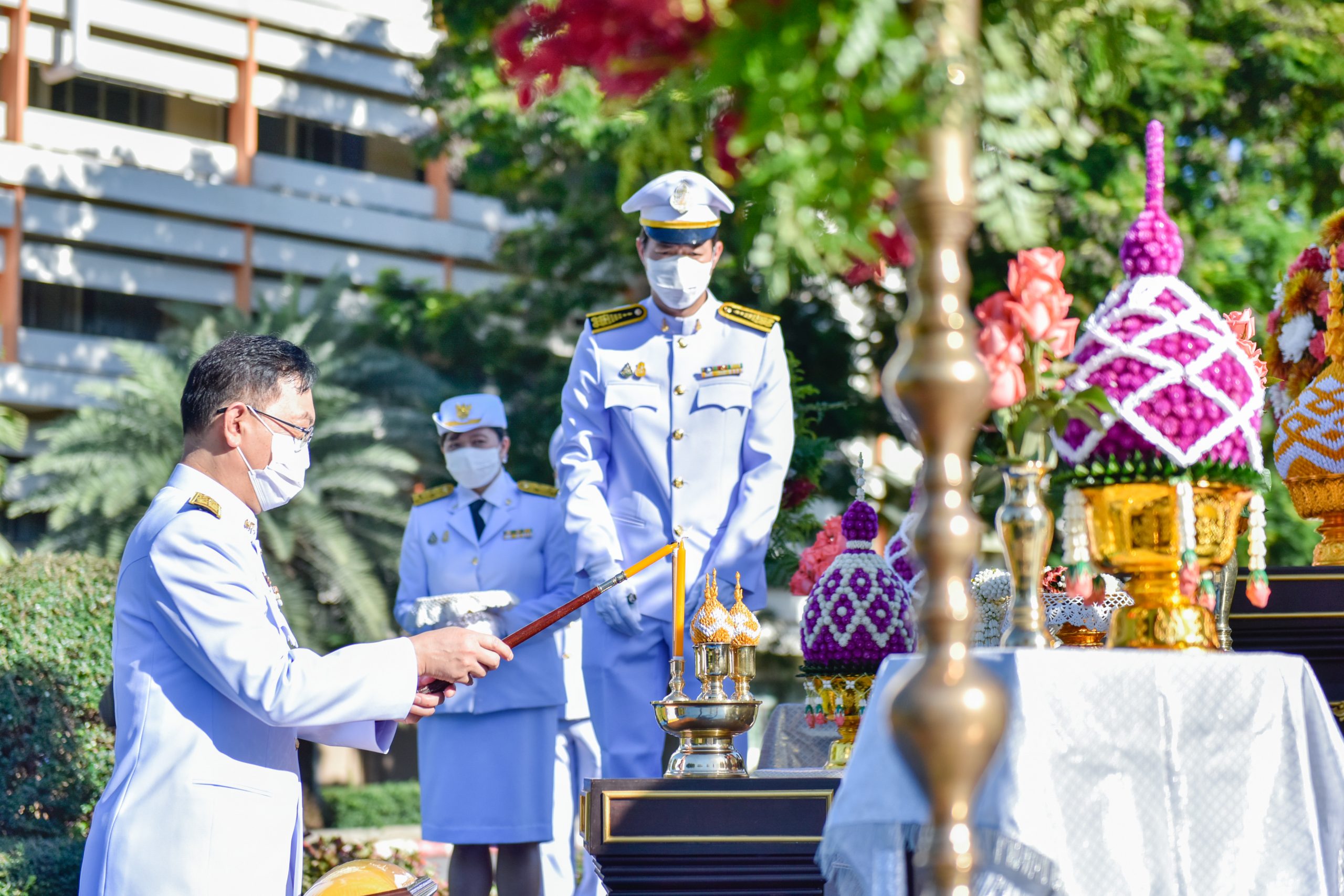 2) กำหนดให้ผู้เข้าร่วมพิธีทุกคน สวมหน้ากากอนามัยตลอดเวลาของการร่วมพิธี (หน้ากากอนามัยสีขาว)