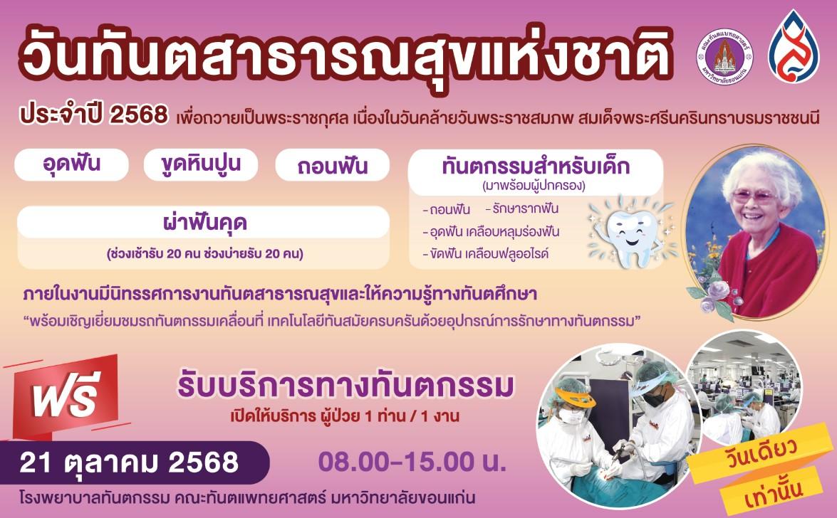 ต.ค. 12 2025 ให้บริการทางทันตกรรมฟรี! ในงานทันตสาธารณสุขแห่งชาติ ประจำปี 2568 (วันเดียวเท่านั้น) ข่าวประชาสัมพันธ์และบริการ, ไม่มีหมวด / By หญิง โพธิสุวรรณ คณะทันตแพทยศาสตร์ มหาวิทยาลัยขอนแก่น ขอเชิญประชาชนทั่วไปเข้าร ให้บริการทางทันตกรรมฟรี! ในงานทันตสาธารณสุขแห่งชาติ ประจำปี 2568 (วันเดียวเท่านั้น) Read More »