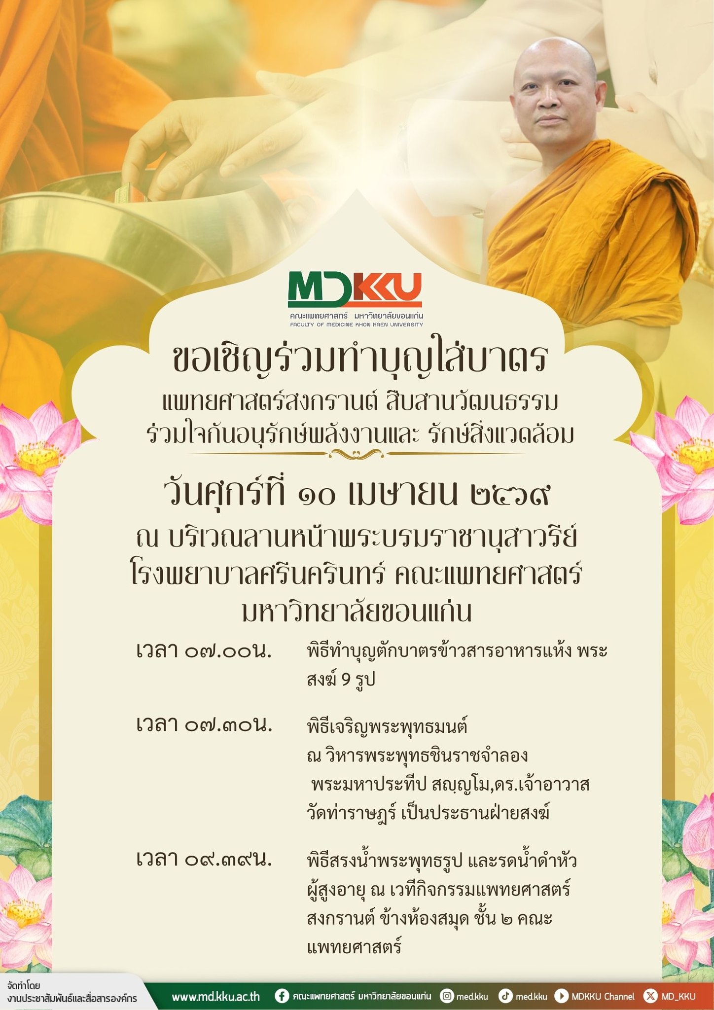 คณะแพทยศาสตร์ มหาวิทยาลัยขอนแก่น ขอเชิญชวนบุคลากร และประชาชนทุกท่าน ร่วมพิธีทำบุญตักบาตร เนื่องในวันสงกรานต์ คณะแพทยศาสตร์
