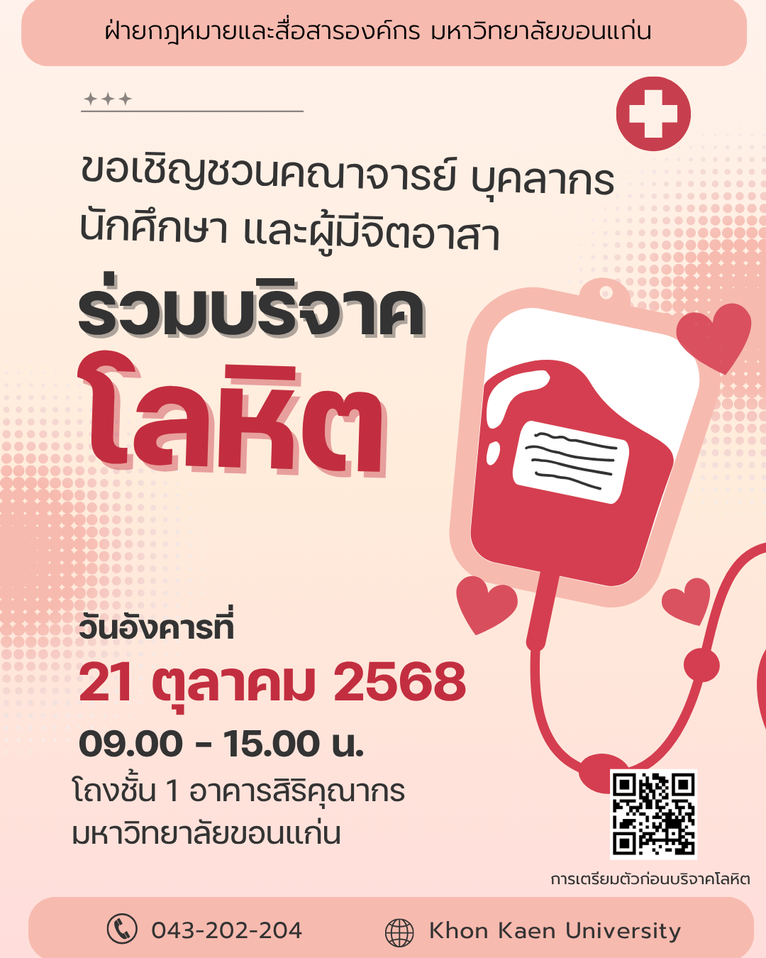 ฝ่ายกฏหมายและสื่อสารองค์กร ร่วมกับ คลังเลือดกลาง คณะแพทยศาสตร์ มหาวิทยาลัยขอนแก่น