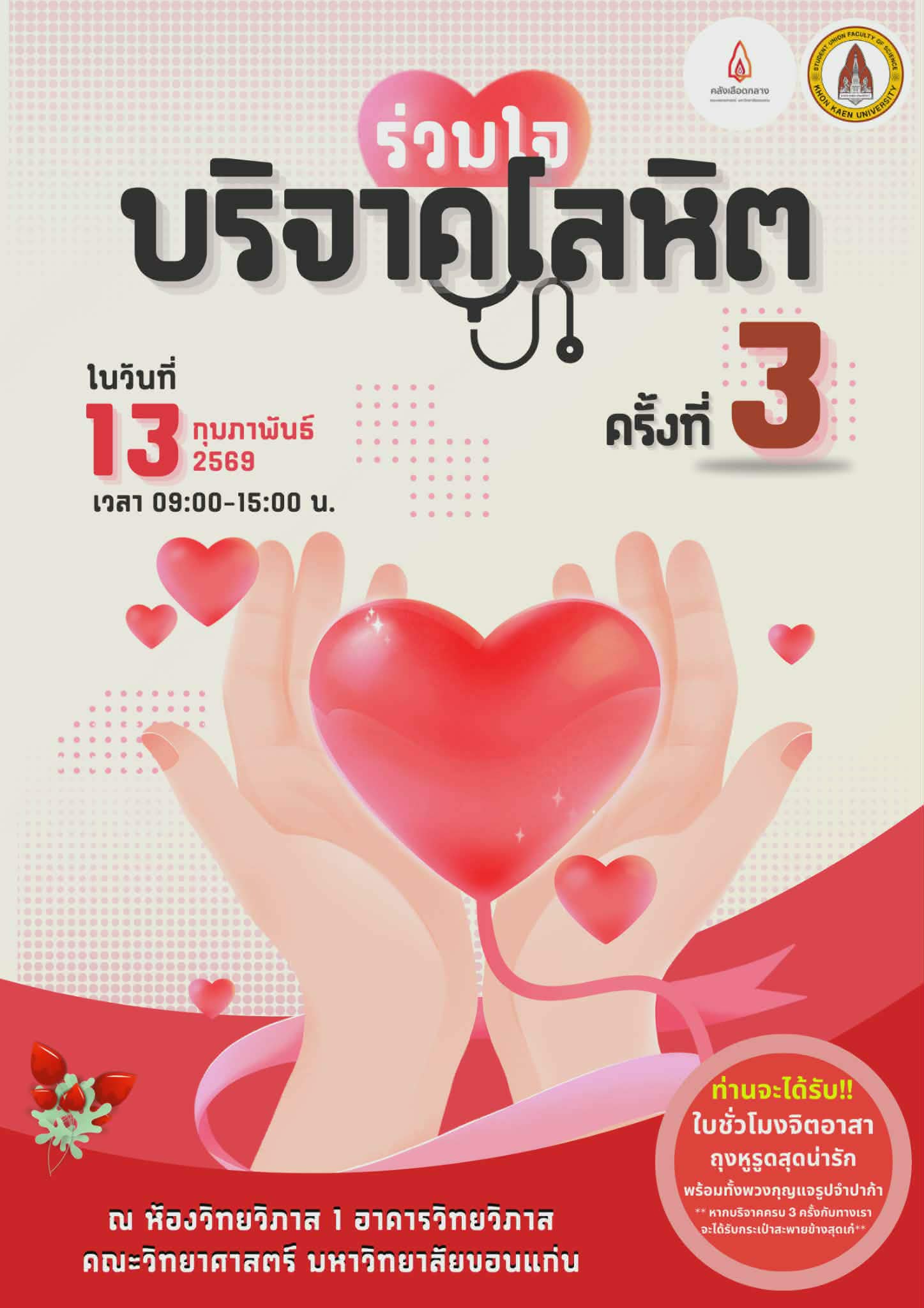 กิจกรรม “ร่วมใจบริจาคโลหิต ครั้งที่ 3” จัดโดยสโมสรนักศึกษาคณะวิทยาศาสตร์ มหาวิทยาลัยขอนแก่น 13 กุมภาพันธ์ @ 9:00 น. - 15:00 น. อาคารวิทยวิภาส คณะวิทยาศาสตร์ ขอเชิญร่วมเป็น "ผู้ให้" ในกิจกรรมบริจาคโลหิต ครั้งที่ 3 หนึ่ง […]
