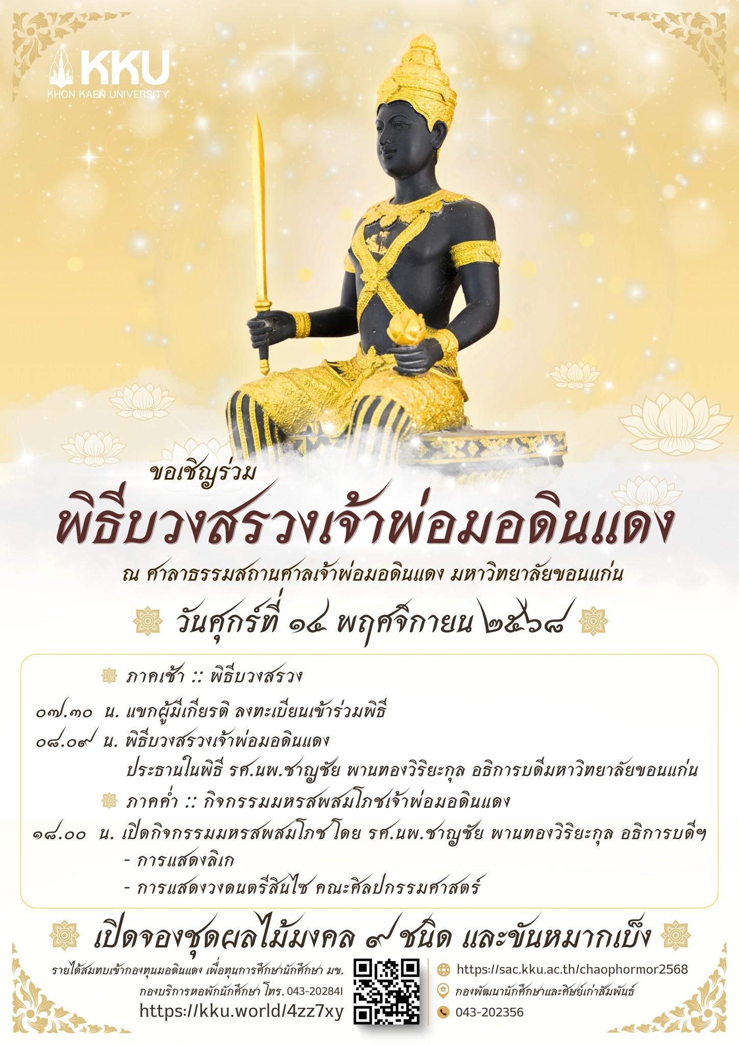 14 พฤศจิกายน @ 8:00 น. - 17:00 น. “พิธีบวงสรวงเจ้าพ่อมอดินแดง” ประจำปี พ.ศ. 2568 ศาลาธรรมสถานศาลเจ้าพ่อมอดินแดง มหาวิทยาลัยขอนแก่น เรียนเชิญทุกท่านร่วมพิธีอันศักดิ์สิทธิ์! . มหาวิทยาลัยขอนแก่น […]